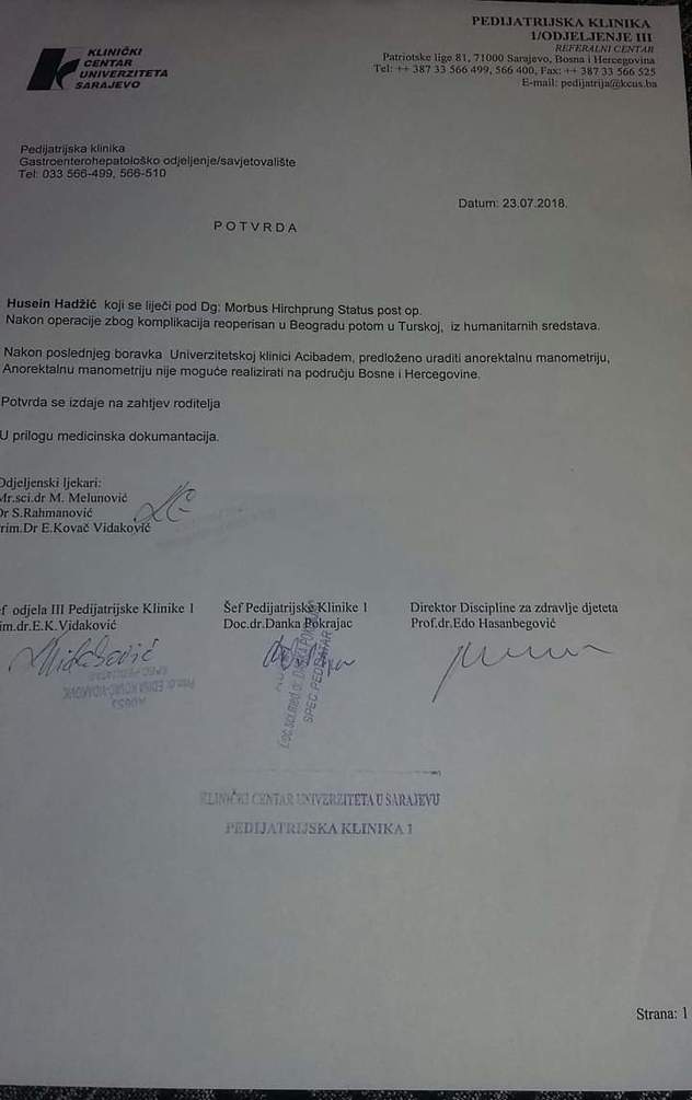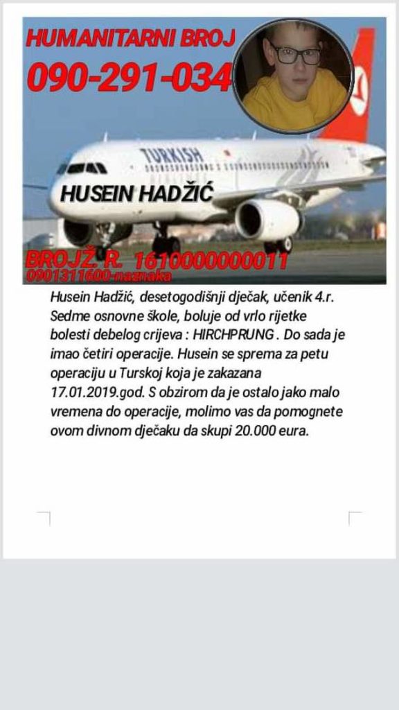 Husein Hadžić je desetogodišnji dječak koji boluje od vrlo rijetke bolesti debelog crijeva – HIRCHPRUNG. Do sada je imao četiri operacije, a njegova porodica više nije u mogućnosti da snosi troškove liječenja. Husein se sprema za petu operaciju u Turskoj koja je zakazana za 17. januar 2019. godine. Za operaciju je potrebno 20.000 eura.