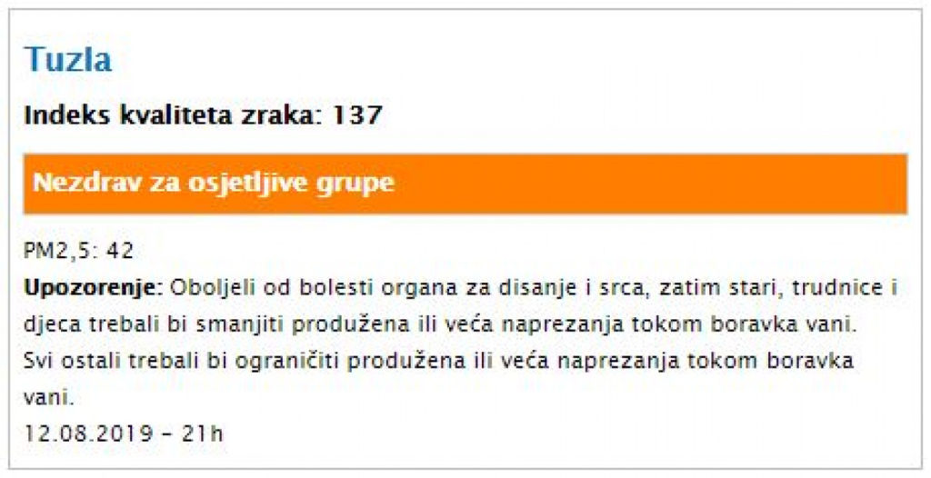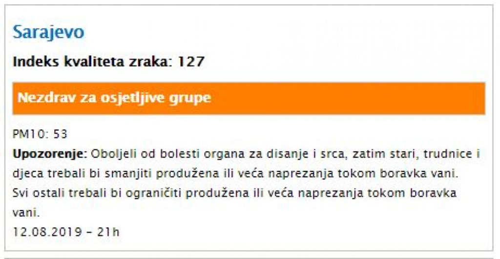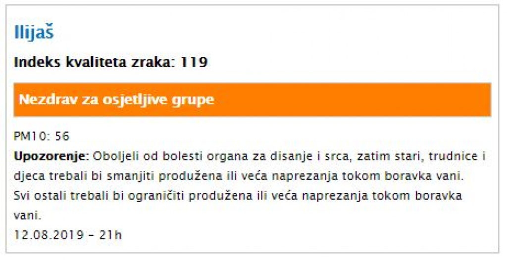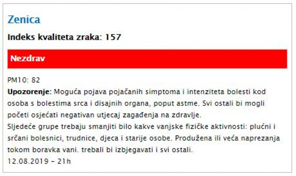 Prema mjerenjima Udruženja „Ekoakcija“ u 21 sat najzagađenija je bila Zenica. Iako je u 21 sat izmjereno čak 28 stepeni, Zeničani udišu nezdrav zrak. Indeks kvaliteta zraka trenutno iznosi 157, a to znači da je moguća pojava pojačanih simptoma i intenziteta bolesti kod osoba s bolestima srca i disajnih organa, poput astme. Svi ostali bi mogli početi osjećati negativan utjecaj zagađenja na zdravlje.