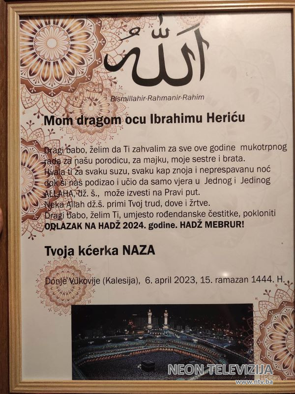 Na papiru, koji će predati ocu, a kasnije i uokviriti kao lijepu uspomenu, Naza je napisala: „Dragi babo, želim da Ti zahvalim za sve ove godine mukotrpnog rada za našu porodicu, za majku, moje sestre i brata. Hvala ti za svaku suzu, svaku kap znoja i neprespavanu noć dok si nas podizao i učio da samo vjera u Jednog i Jedinog ALLAHA, dž. š., može izvesti na Pravi put. Neka Allah dž.š. primi Tvoj trud, dove i žrtve.