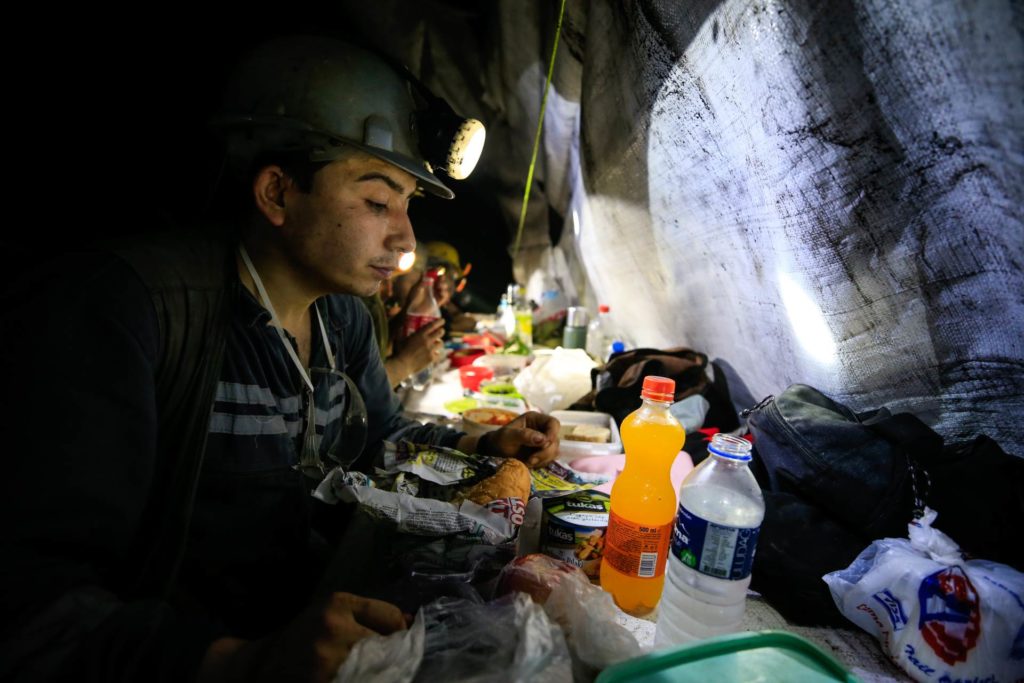 Radnici koji rade u rudniku privatne firme u okrugu Eynez, formirali su drvene stolove u mračnom hodniku, osvijetljenom svjetlom s rudarske kacige.