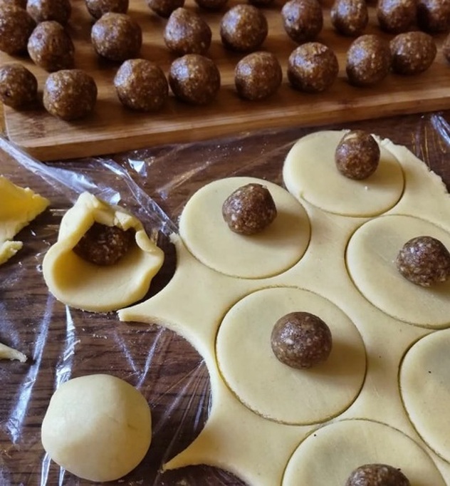 Od pripremljenog tijesta otkidajte komadiće, oblikujte u loptice pa u njima napravite udubljenje. Udubljenje u tijestu punite pastom odnosno lopticama koje ste prethodno formirali te zatvorite tijestom.