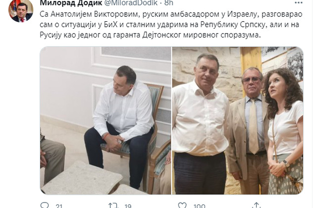 Član Predsjedništva BiH Milorad Dodik izazvao je novi diplomatski skandal nakon što se u Izraelu sastao s ruskim ambasadorom u toj zemlji Anatolijem Viktorovim, zaobilazeći pri tome uobičajene diplomatske procedure.
