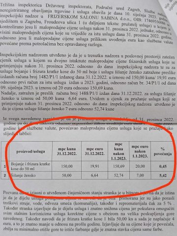 Državni inspektorat u Hrvatskoj se pohvalio kako su odrezali 151 novčanu kaznu, na ukupno 234.000 eura, za poduzetnike koji su povećali cijene bez opravdanja. Jedna od onih kojoj su poslali bijelu omotnicu s kaznom od 3000 eura (oko 6000 KM) je zagrebačka frizerka Sabina Samardžija. Odrezali su joj 1990,84 eura kazne kao pravnoj osobi, plus 1327,23 eura kao odgovornoj osobi.