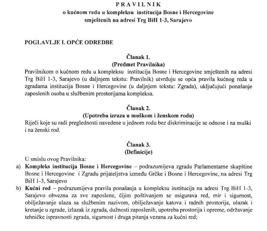 Kako je Zajednički kolegij oba doma Parlamentarne skupštine BiH i zahtjevao, Služba za zajedničke poslove institucija BiH sačinila je prijedlog kućnog reda u državnim institucijama odnosno u zgradama u centru Sarajeva, saznaje Fokus.