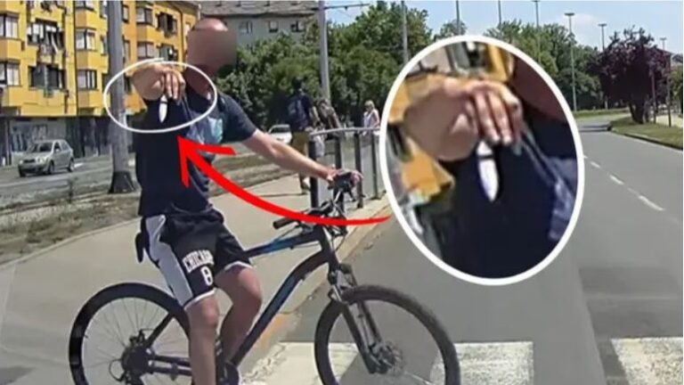 U tom trenutku ćelavi mladić na biciklu vozi preko zebre i maše nečime prema instruktoru i kandidatu. Kad se bolje pogleda, vidi se da mladić u ruci ima nož! Čini se da to instruktor isprva ne primijećuje.