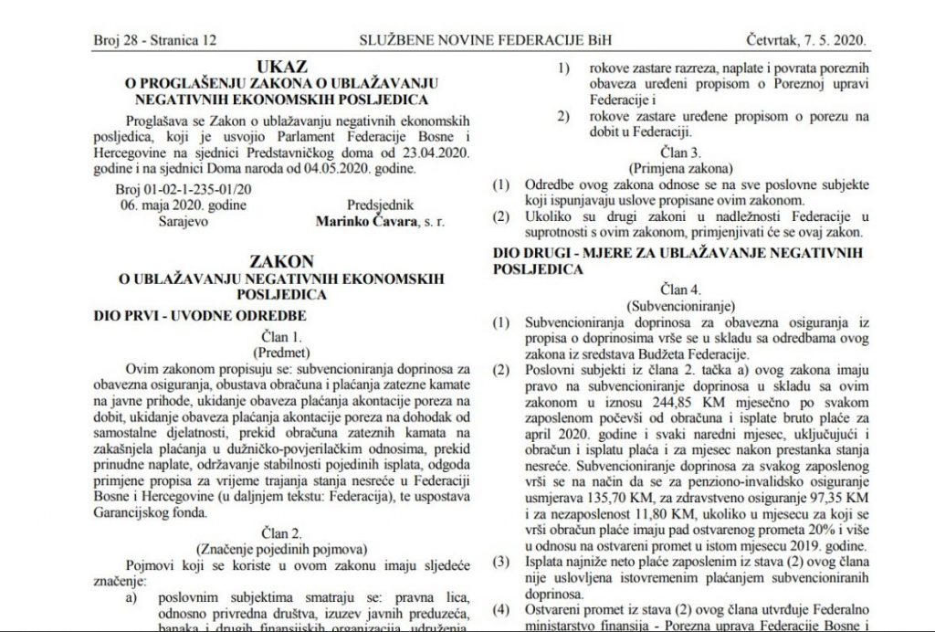 Ukidanje stanja nesreće, prema članu 4. ovog zakona, znači da će se iz federalnog budžeta za radnike firmi pogođenih pandemijom plaćati doprinosi još za ovaj mjesec. Barem na papiru. Na terenu je drugačije jer još niko nije dobio ni marku.