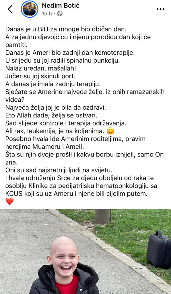 -Najveća želja joj je bila da ozdravi. Eto Allah dade, želja se ostvari. Sad slijede kontrole i terapija održavanja. Ali rak, leukemija, je na koljenima – napisao je.