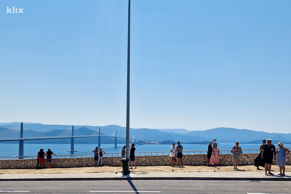 Brojni turisti i prolaznici zaustavljaju se tu kako bi snimili jedinstvene fotografije s Pelješkim mostom u pozadini.