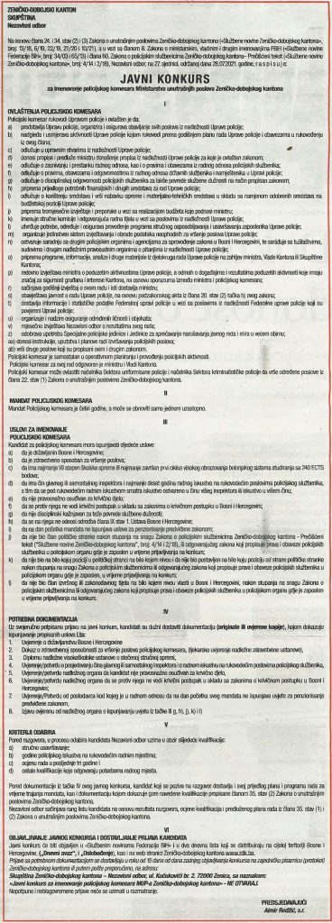 Javni konkurs za imenovanje policijskog komesara Ministarstva unutrašnjih poslova ZDK, objavljen u Oslobođenju 31.07.2021. godine.