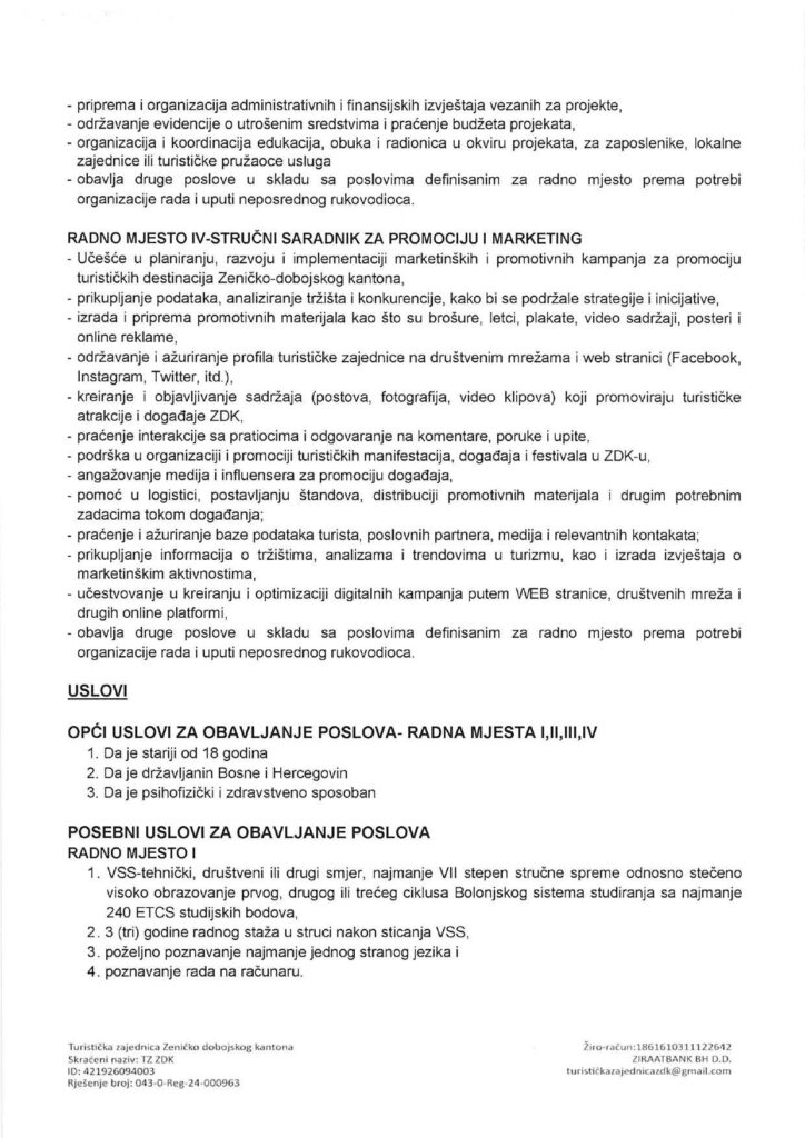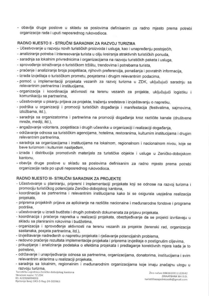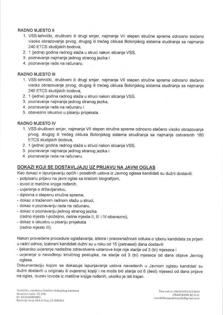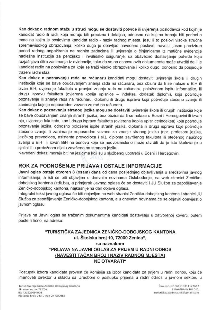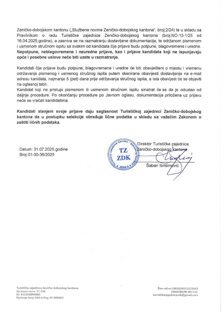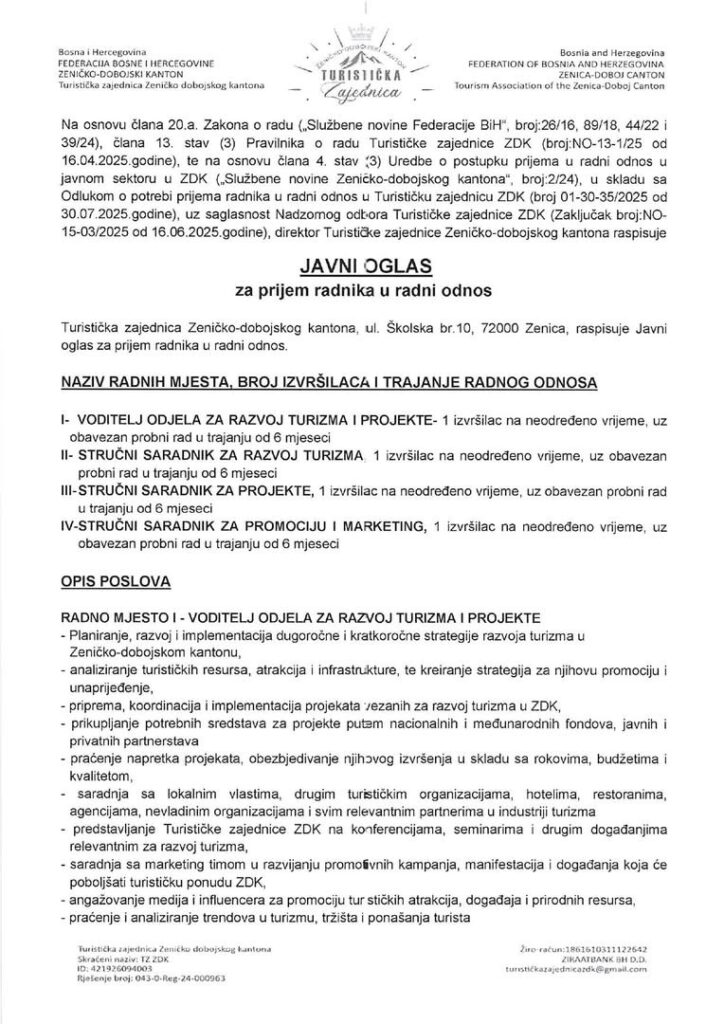 Oglas je raspisan u skladu s Odlukom o potrebi prijema radnika, uz saglasnost Nadzornog odbora Turističke zajednice ZDK.