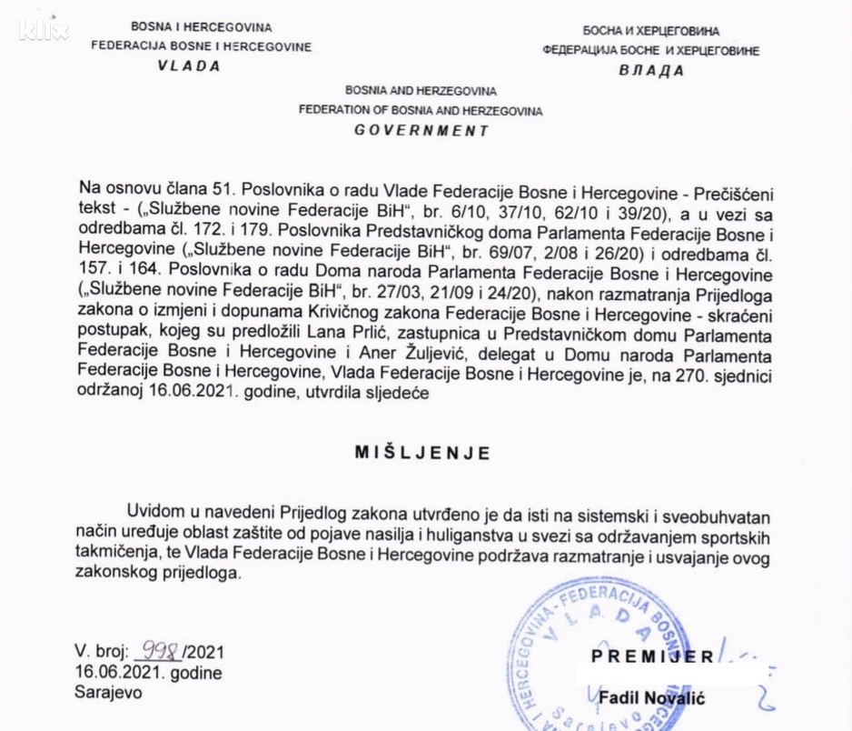 “Uvidom u navedeni prijedlog zakona utvrđeno je da isti na sistemski i sveobuhvatan način uređuje oblast zaštite od pojave nasilja i huliganstva u svezi sa održavanjem sportskih takmičenja, te vlada Federacije Bosne i Hercegovine podžava razmatranje i usvajanje ovog zakonskog prijedloga”, stoji u mišljenju koje je zastupnicima dostavljeno iz ureda premijera Fadila Novalića.