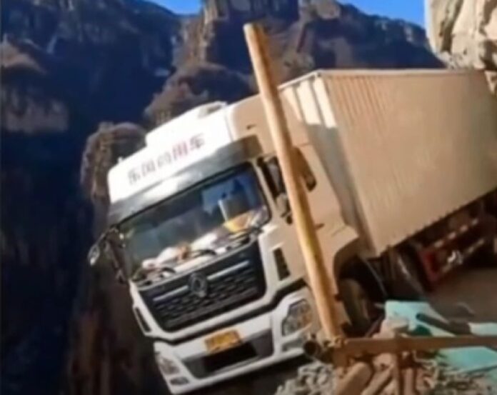 Jedan kamion ostao je tri dana “visiti” preko litice nakon što je vozač pokušao okrenuti se na planinskom putu u Kini.