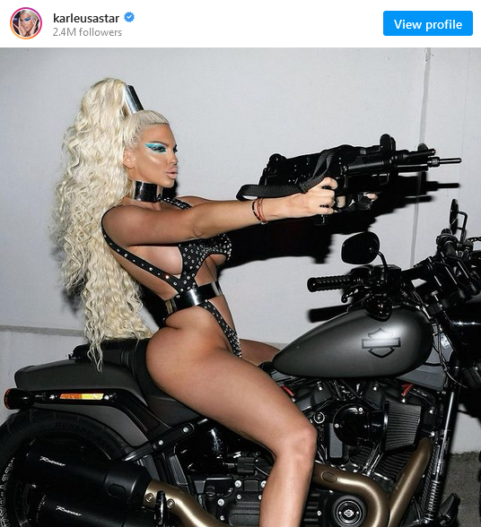 Karleuša je pozirala u provokativnom crnom kostimu. Ona se fotografirala sjedeći na motoru, a u rukama držala automatsku pušku “uzi”, što je prizor učinilo još opasnijim po mnoge muškarce.