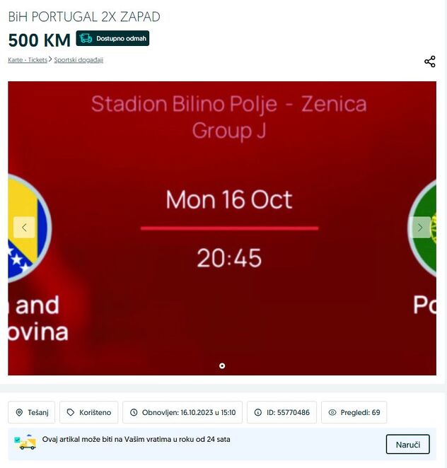 Iako je do početka utakmice kvalifikacija za EURO između Bosne i Hercegovine i Portugala ostalo još svega par sati i dalje se na tržištu mogu pronaći ulaznice za ovaj dvoboj.
