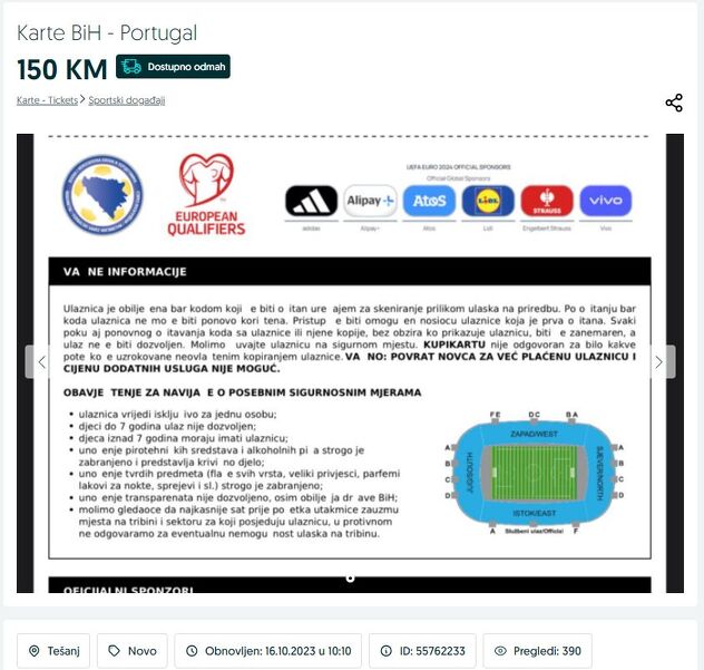 Tako se na internet oglasniku “Olx.ba” njihova cijena kreće od 150 pa sve do 500 KM, zavisno od tribine za koju se odlučite.