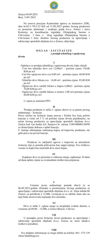 Na osnovu procjene Kantonalne uprave za šumarstvo ZDK, akta br:02-1-7011/23 KH od 31.08.2023 godine Javnog preduzeća za prostorno planiranje i uređenje grada d.o.o. Zenica i stava Komisije za koordinaciju izgradnje Olimpijskog bazena u Crkvicama I faza, a zbog izgradnje Olimpijskog bazena u Crkvicama I faza: direktor Javnog preduzeća za upravljanje i održavanje sportskih objekata d.o.o Zenica, objavljuje O G L A S – L I C I T A C I J A o prodaji tehničkog i ogrijevnog drveta