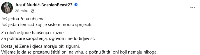 Još jedna žena ubijena! Još jedan femicid koji je sistem morao spriječiti! Za obične ljude hapšenja i kazne. Za političare saopštenja, izgovori i nedodirljivost. Dosta je! Žene i djeca moraju biti sigurni. Vrijeme je da se prestanu štititi oni na vrhu, a počnu štititi oni koji nemaju nikoga – poručio je Nurkić.