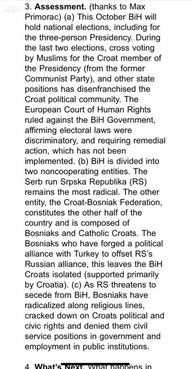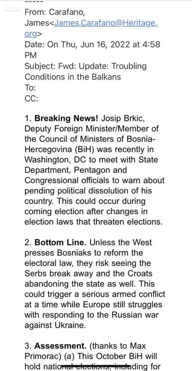 “Ukoliko Zapad ne pritisne Bošnjake da reformišu Izborni zakon, rizikuju da se Srbi otcijepe, a da i Hrvati napuste državu. Ovo bi moglo izazvati ozbiljan oružani sukob u trenutku dok se Evropa još uvijek bori s odgovorom na rat Rusije protiv Ukrajine. (Zahvala Maxu Primorcu). U oktobru će se održati nacionalni izbori, uključujući i za tročlano Predsjedništvo”, navodi se u emailu.