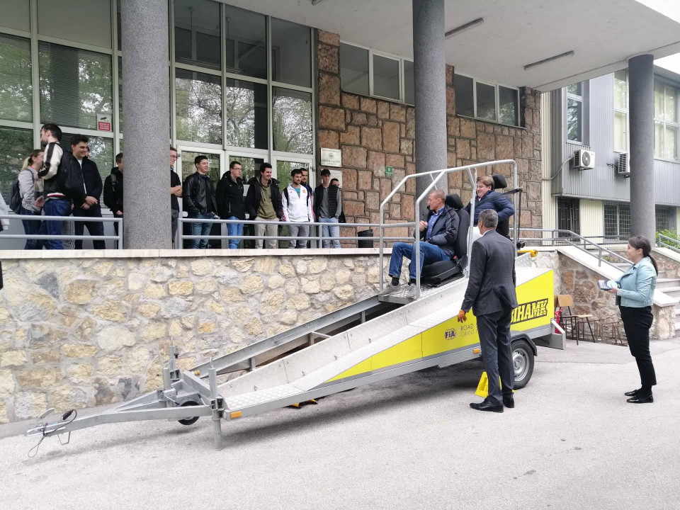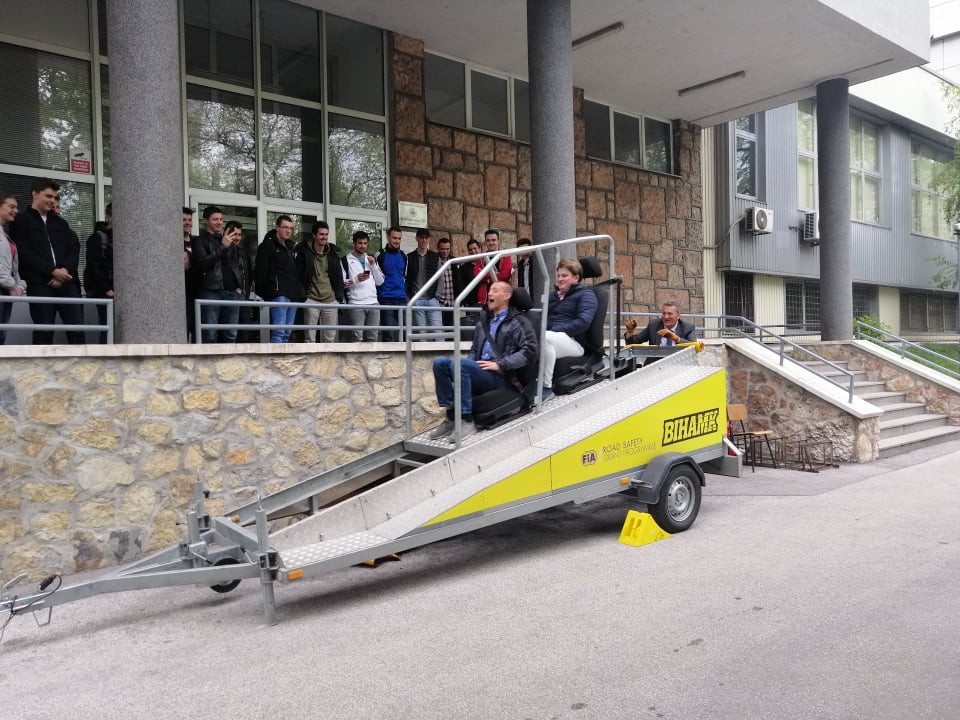 Ispred Mašinskog fakulteta danas je održana kampanja “Sigurno vezani u vozilu” u organizaciji BIHAMK-a. Studenti i zainteresirani prolaznici mogli su isprobati simulator čeonog sudara i vidjeti kako izgleda sudar pri brzini od 40km/h.