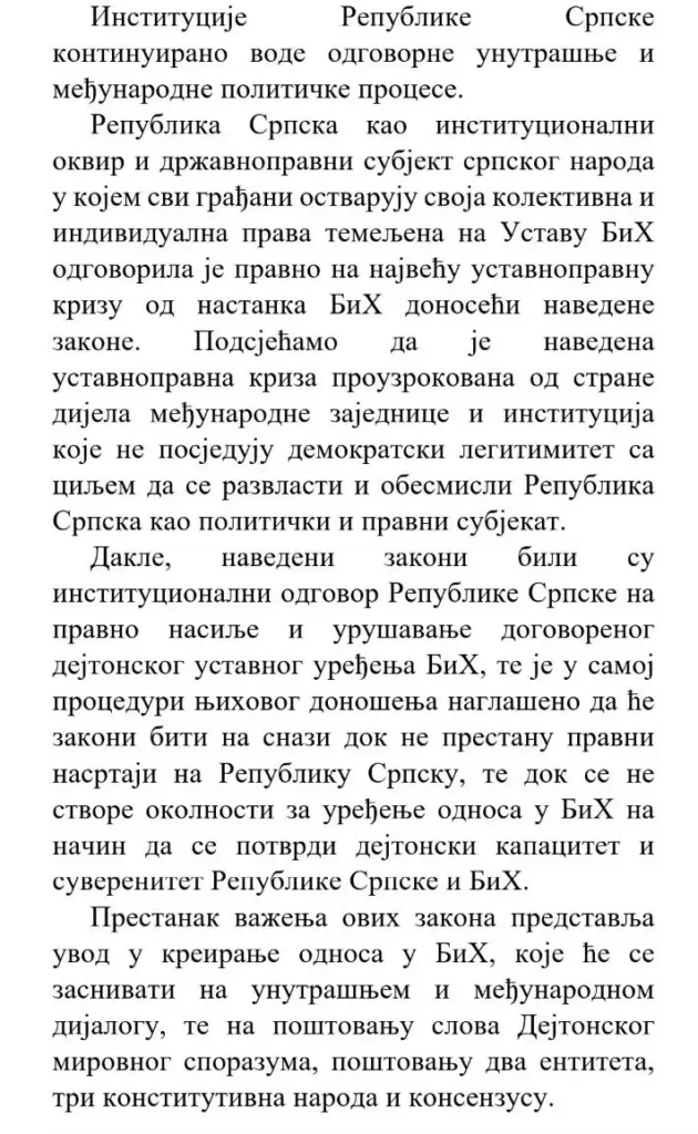 Prema njegovim riječima, Narodna skupština Republike Srpske je 18. oktobra 2025. godine, usvajanjem zakona kojim se formalno ukida prethodni akt, „faktički sprovela Schmidtovu odluku, a ne odluku Ustavnog suda“.