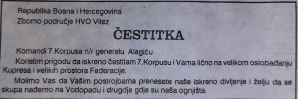 “Komandi 7. korpusa, n/r generalu Alagiću. Koristim prigodu da iskreno čestitam 7. korpusu i Vama lično na velikom oslobađanju Kupresa i velikih prostora Federacije. Molimo Vas da Vašim postrojbama prenesete naše iskreno divljenje i želju da se skupa nađemo na Vodopadu i drugdje gdje su naša ognjišta.”