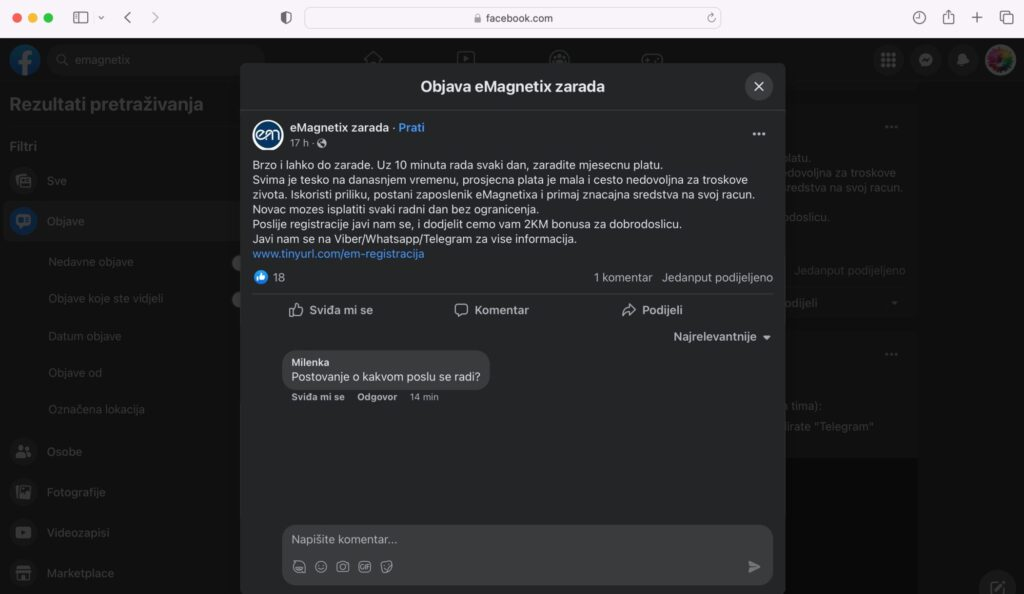 “Brzo i lahko do zarade. Uz deset minuta rada svaki dan, zaradite mjesečnu platu”, stajalo je u jednoj od objava na Facebooku.