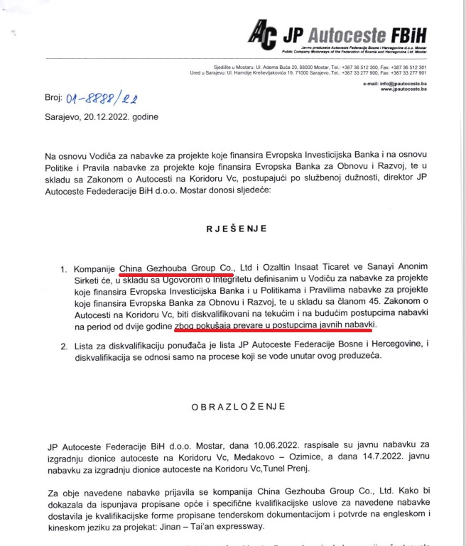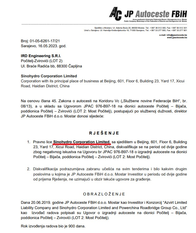 U rješenju Autocesta, kada je riječ o diskvalifikaciji kineskih firmi Sinohydro Corporation Limited te Powerchina Roadbridge Group Co. Ltd stoji da ona predstavlja zabranu učešća na svim tenderima i bilo kakvim drugim poslovima u kojima su Autoceste FBiH investitor i to u periodu od dvije godine, ne uzimajući u obzir tekuće ugovore za građenje.
