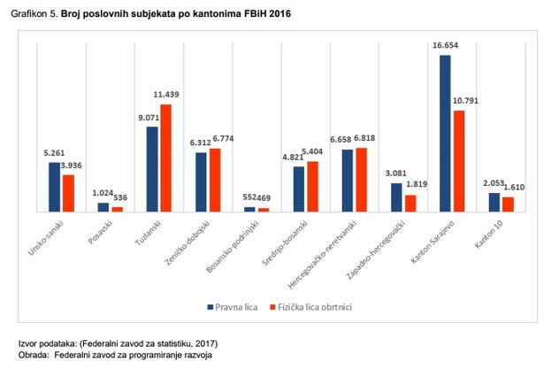 Gledano po kantonima najveći broj poslovnih subjekata na kraju 2016. godine registrovan je u Kantonu Sarajevo sa učešćem od 26,1 posto u odnosu na ukupan broj poslovnih subjekata u FBiH, Tuzlanskom kantonu sa učešćem od 19,5 posto, dok je najmanje učešće registrovano u Posavskom kantonu sa 1,5 posto i Bosansko podrinjskom kantonu sa učešćem od 1,0 posto u ukupnom broju poslovnih subjekata u FBiH.