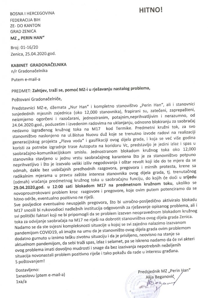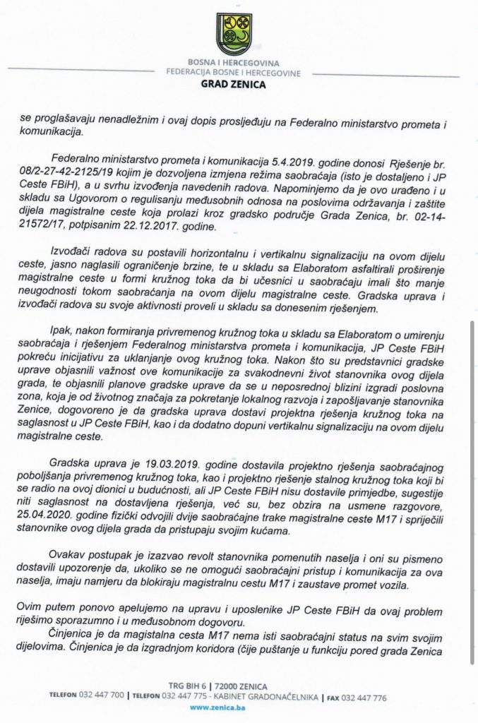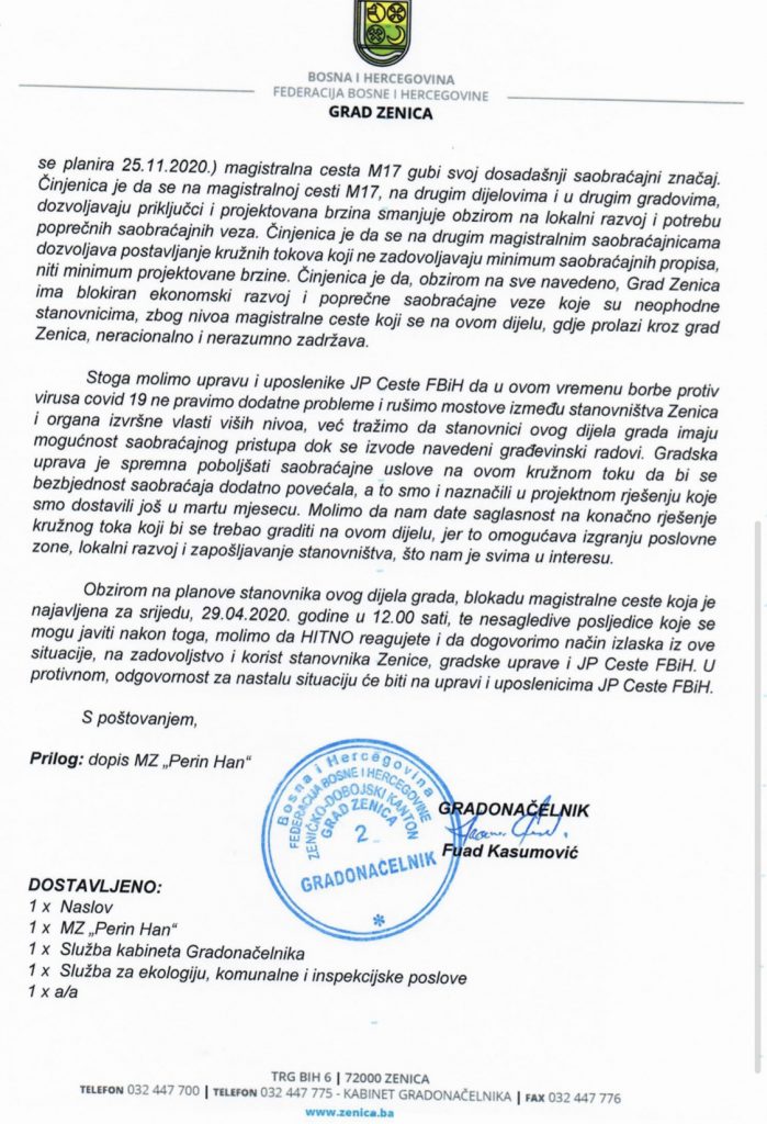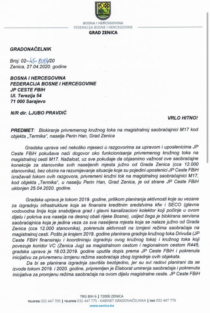 Gradonačelnik Zenice Fuad Kasumović uputio je danas dopis direktoru JP Ceste FBiH, a povodom blokiranja privremenog kružnog toka na  magistralnoj saobraćajnici M17 kod objekta “Termika”, naselje Perin Han.