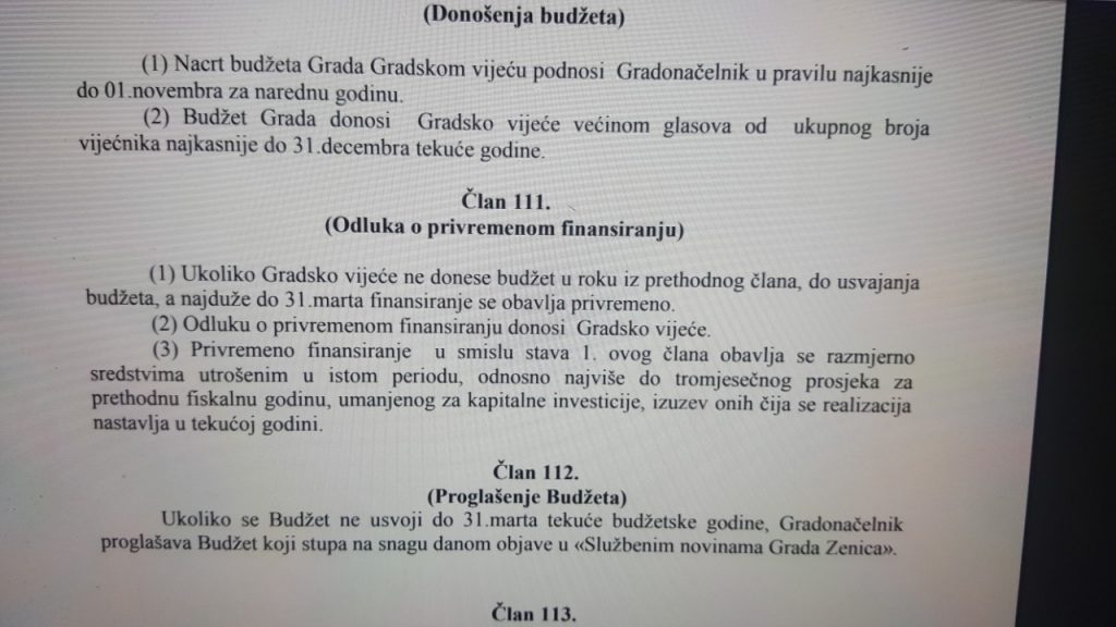 Obzirom da je sjednica Gradskog vijeća zakazana za ponedjeljak, 10. februara 2020. godine, ovim putem ponovo želim napomenuti, da je shodno odredbama člana 35. Zakona o budžetima u FBiH i člana 111. Statuta Grada Zenica, Gradsko vijeće obavezno donijeti Odluku o privremenom finansiranju.
