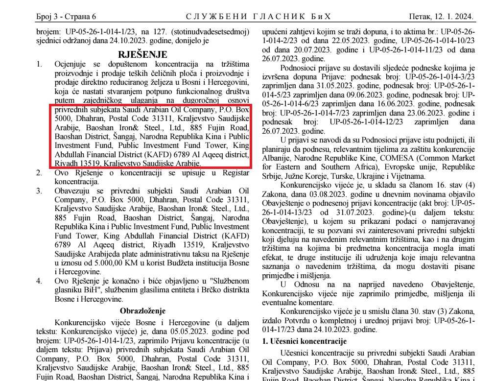 Naime, Konkurencijsko vijeće BiH, kako stoji u rješenju, odobrilo je privrednim subjektima, saudijskom naftnom gigantu Saudi Arabian Oil Company (Aramco) i jednom od najvećih svjetskih proizvođača čelika kompaniji Baoshan Iron& Steel Ltd. (Baosteel) iz Kine, koncentraciju na tržištima proizvodnje i prodaje teških čeličnih ploča i proizvodnje i prodaje direktno reduciranog željeza u Bosni i Hercegovini.