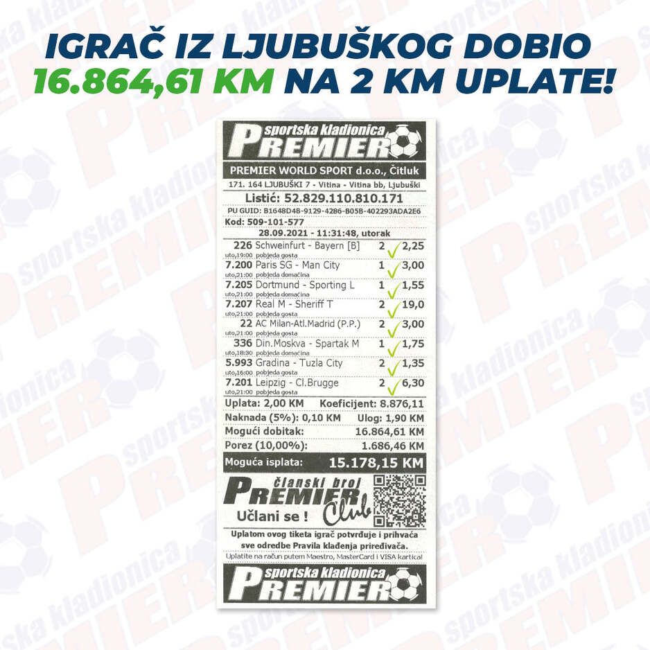 Inače, tiket koji je odigrao svakako zaslužuje pohvalu kod kladioničara budući da je 15.000 KM dobio na samo dvije uložene marke.