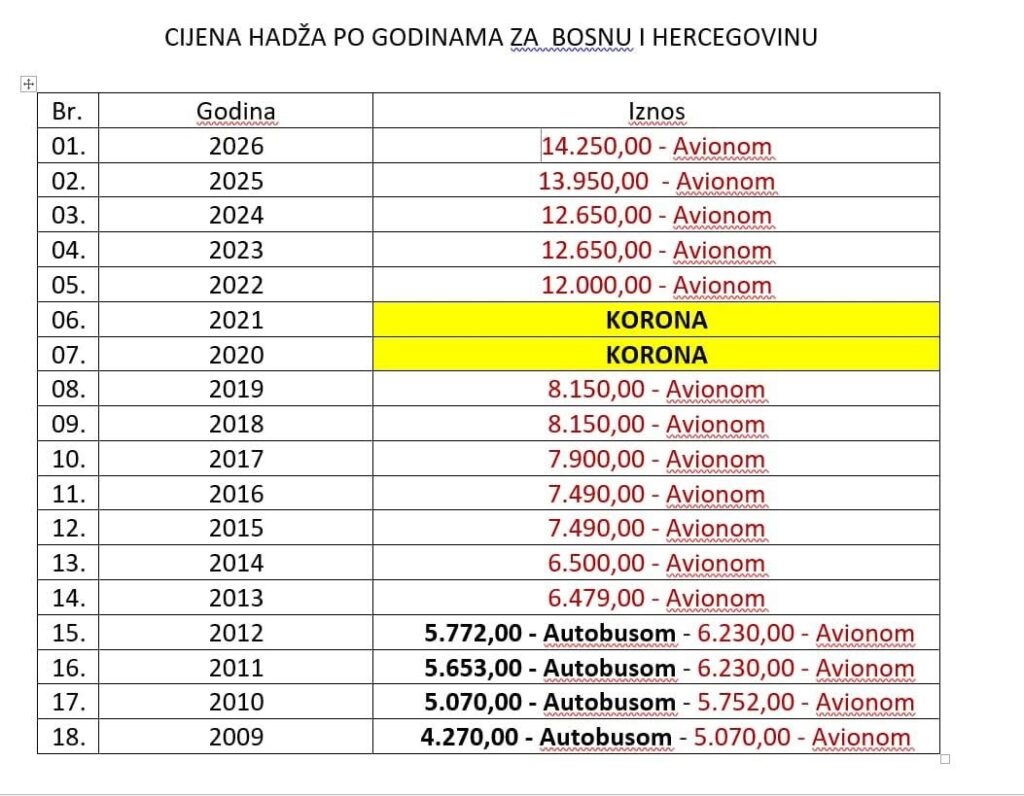 Hadž za vjernike iz Bosne i Hercegovine nikad nije bio skuplji. Prema podacima iz dostavljene tabele, cijena aranžmana za 2026. godinu iznosi 14.250 KM (avionom). To je čak 9.180 KM više nego 2009. kada je avionski aranžman koštao 5.070 KM – rast od oko 181% u sedamnaest godina, piše 072info.