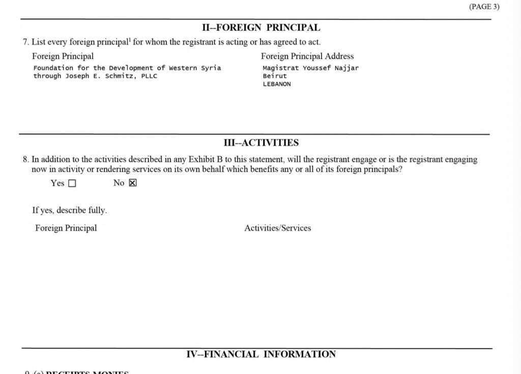 Inače, u dokumentima Ministarstva pravda SAD koji se odnose na spomenutu lobističku firmu Tiger Hill Partners, spominje se i ime Josepha Schmitza i to upravo kao čelnika Fondacije za razvoj Zapadne Sirije.