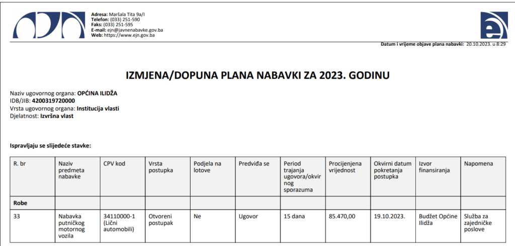 Planom javnih nabavki za 2023. godinu Općina Ilidža planirala je kupovinu putničkog automobila. Procijenjena vrijednost nabavke bila je 40.000 KM.