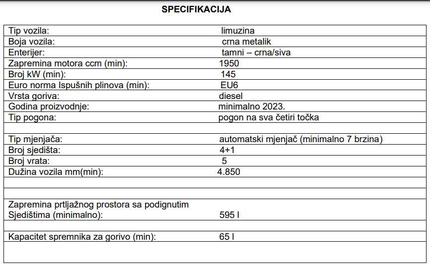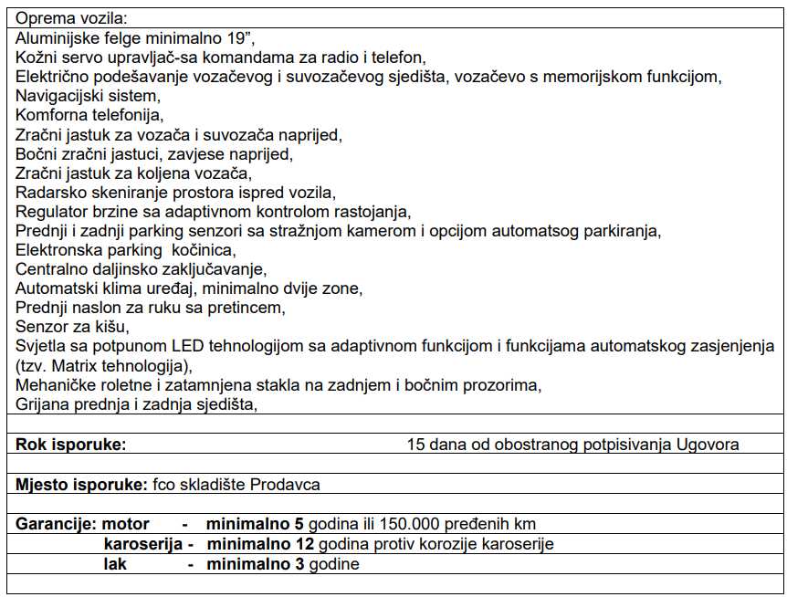 Osim detaljno navedenih specifikacija vozila naveden je rok isporuke od 15 dana.