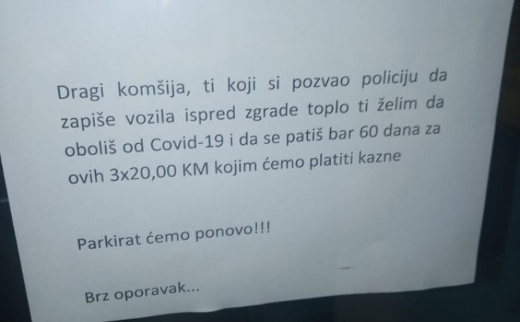 – Dragi komšija, ti koji si pozvao policiju da zapiše vozila ispred zgrade toplo ti želim da oboliš od Covid-19 i da se patiš bar 60 dana za ovih 3X20,00 KM kojim ćemo platiti kazne. Parkirat ćemo ponovo – stoji u poruci.