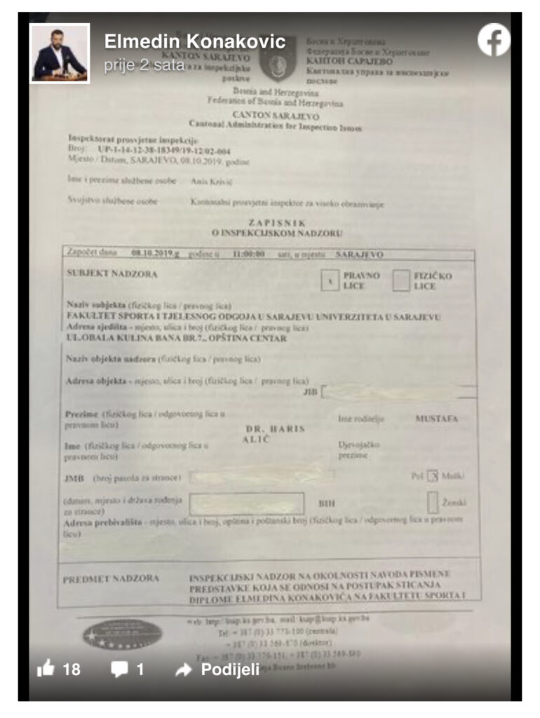 Na Facebooku je objavio fotografije, kako kaže, prve stranice izvršenog nadzora diplome.