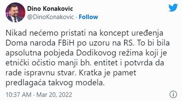 “Nikad nećemo pristati na koncept uređenja Doma naroda FBiH po uzoru na RS. To bi bila apsolutna pobjeda Dodikovog režima koji je etnički očistio manji bh. entitet i potvrda da rade ispravnu stvar. Kratka je pamet predlagaća takvog modela”.