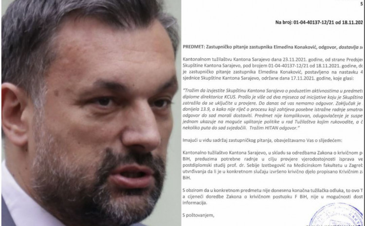 Lider Naroda i pravde te zastupnik u Skupštini Kantona Sarajevo Elmedin Konaković nekoliko je puta do sada tražio od Tužilaštva Kantona Sarajevo da ga obavijeste o tome dokle se stiglo s provjerom diplome direktorice KCUS-a Sebije Izetbegović.
