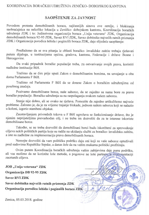 KOORDINACIJA BORAČKIH UDRUŽENJA ZDK: Sva pitanja rješavati u nadležnim institucijama, a ne blokiranjem puteva!