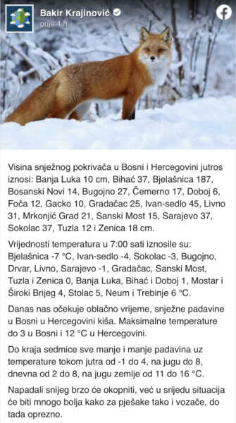 “Do kraja sedmice sve manje i manje padavina uz temperature tokom jutra od minus jedan do četiri stepena celzijusova, na jugu do osam stepeni. Dnevna od dva do osam stepeni, na jugu zemlje od 11 do 16 stepeni. Napadali snijeg brzo će okopniti, već u srijedu situacija će biti mnogo bolja, kako za pješake, tako i za vozače, do tada oprezno”, naglasio je Krajinović.