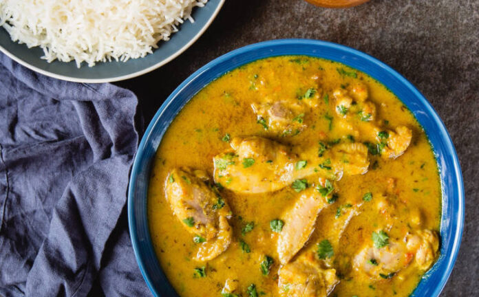 Sastojci: 1 kg piletine, 3 čehna bijelog luka, 2 limuna, 2 kašičice soli, četvrtina kašičice čilija u prahu, četvrtina šoljice listova korijandra, 1 glavica luka, 1 rajčica, 1 čili papričica, 2 kašike maslinova ulja, četvrtina kašičice mljevenog korijandra, četvrtina kašičice kumina, četvrtina kašičice kurkume, 400 ml nezaslađena kokosova mlijeka, 2 kašike masnijeg vrhnja, so, riža.