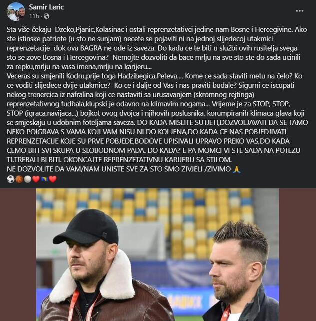 “Šta više čekaju Džeko, Pjanić, Kolašinac i ostali reprezentativci jedine nam Bosne i Hercegovine. Ako ste istinske patriote (u što ne sumnjam), nećete se pojaviti ni na jednoj sljedećoj utakmici reprezentacije dok ova bagra ne ode iz Saveza.