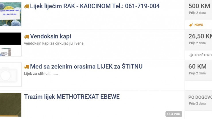 Svjetska zdravstvena organizacija (WHO) nedavno je upozorila na opasnost od sve češće pojave kupovine lijekova putem internetskih oglasa, jer mogu biti kobni. I pacijenti u Bosni i Hercegovini nerijetko, umjesto u apotekama, lijekove kupuju putem oglasa zato što su jeftiniji.