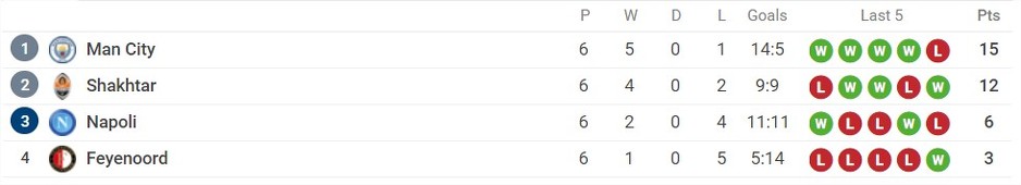 Šahtar je u Harkivu dočekao Manchester City, a Guardiola je na teren poslao drugi tim Građana. Šahtar je to iskoristio i pobjedom je prošao u nokaut fazu takmičenja. Bernard u 26. i Ismaily u 32. minuti su pogodili za velika tri boda ukrajinske ekipe. Počasni pogodak za City je postigao Aguero iz penala u 90+2. minuti.
