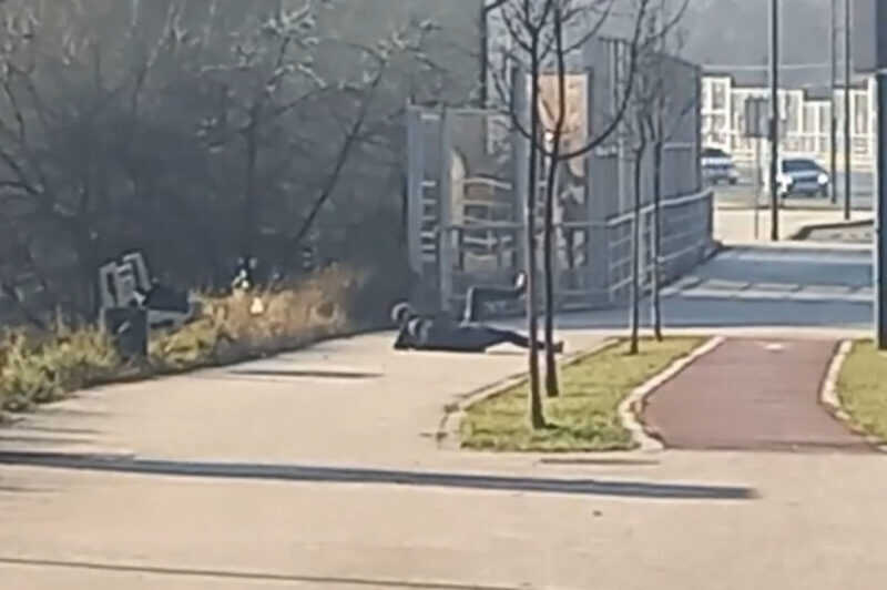 U sarajevskom naselju Dobrinja, muškarac srednjih godina snimljen je danas kako pada na trotoar.