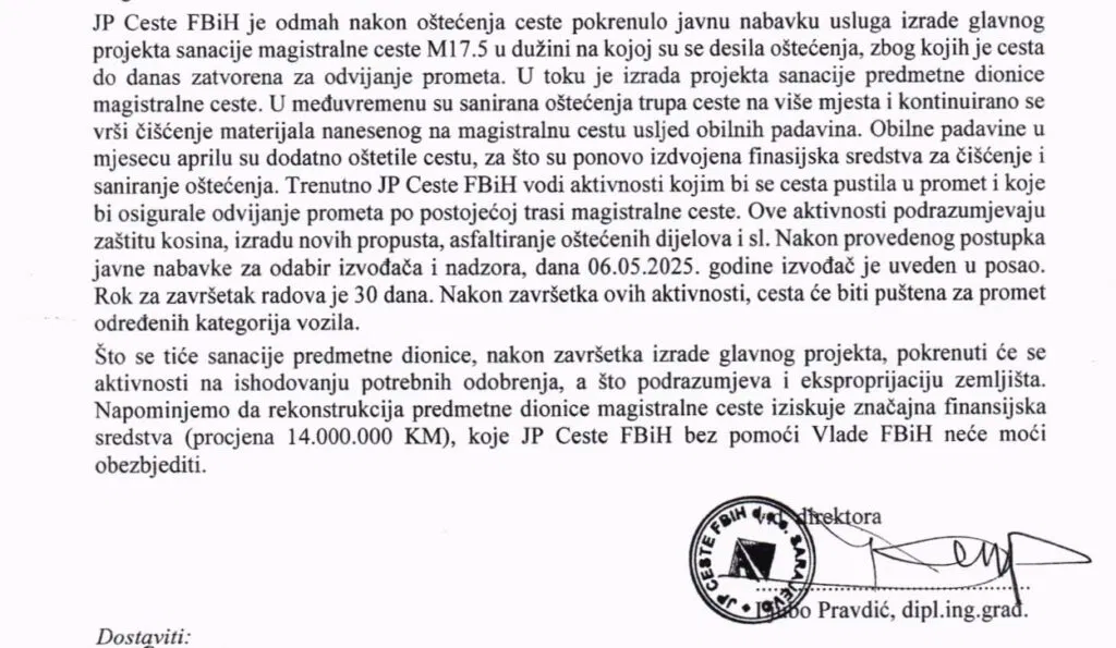 -Što se tiče sanacije predmetne dionice, nakon završetka izrade glavnog projekta pokrenute su aktivnosti na ishodovanju potrebnih odobrenja, a što podrazumijeva i eksproprijaciju zemljišta. Napominjemo da rekonstrukcija predmetne dionice magistralne ceste iziskuje značajna finansijska sredstva (procjena 14.000.000 KM), koje JP Ceste FBiH bez pomoći Vlade FBiH neće moći obezbjediti – kaže se u aktu JP Ceste FBiH.