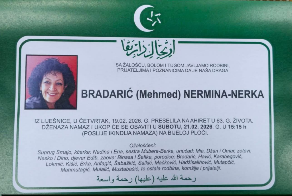 Tužna vijest potresla je Maglajski kraj, napustila nas je Bradarić Nermina, svima poznata kao Nerka, medicinska sestra čije je ime godinama bilo sinonim za dobrotu, toplinu i nesebičnu brigu o drugima, piše 072info.