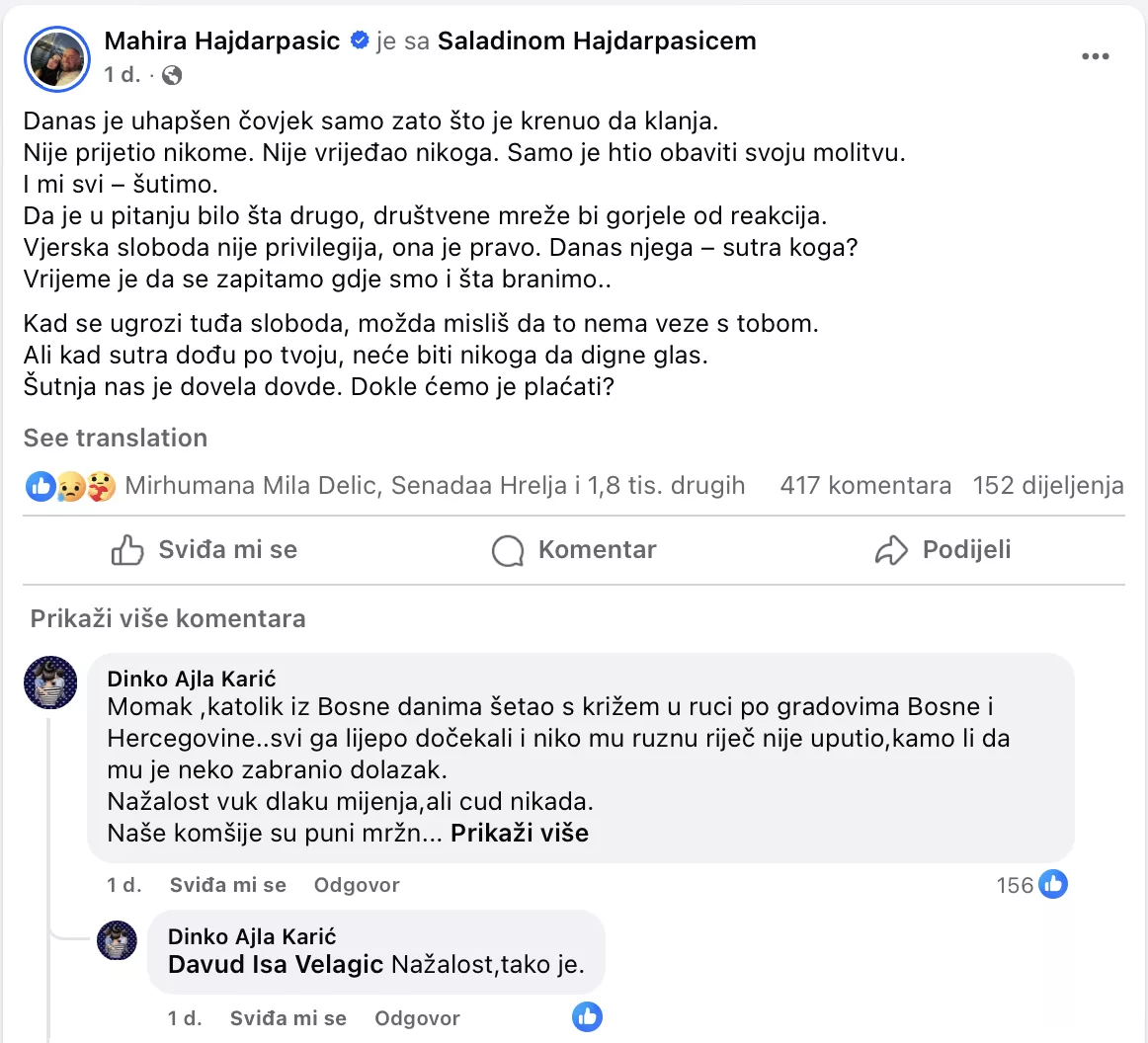 Mahira oštro o incidentu u Širokom: Uhapšen jer je krenuo da klanja. I mi svi – šutimo. Dokle ćemo plaćati cijenu šutnje?